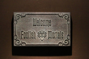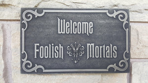 Disney Haunted Mansion Welcome Foolish Mortals inspired sign silver finish
