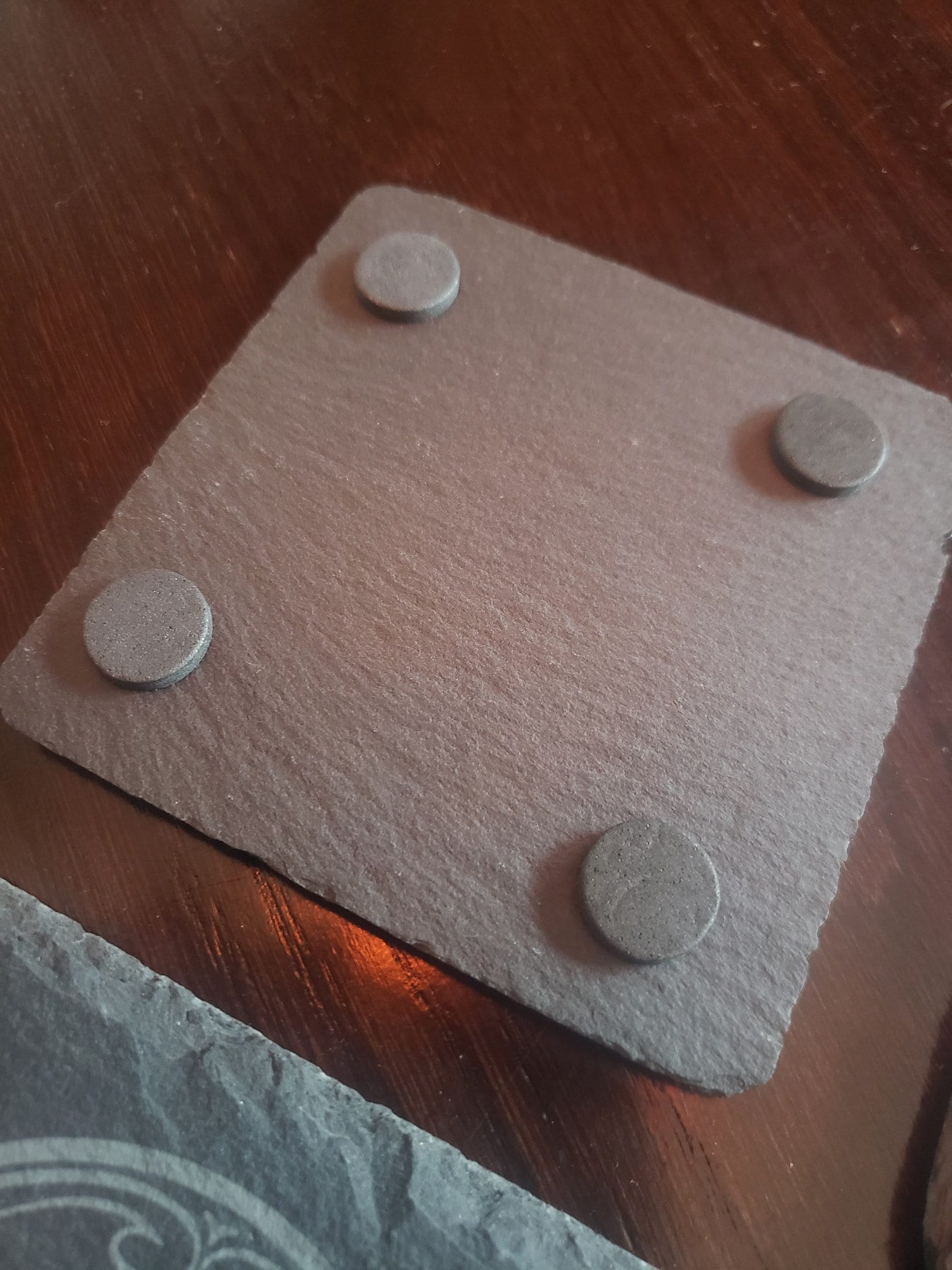 Each of these natural slate coasters measures approximately 4" x 4" and have foam pads on the bottom to protect your table surface