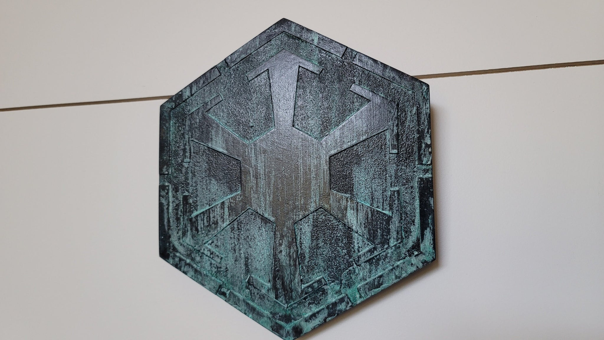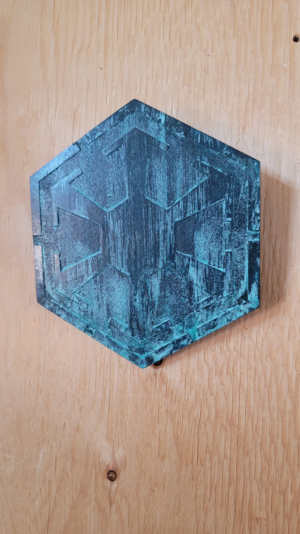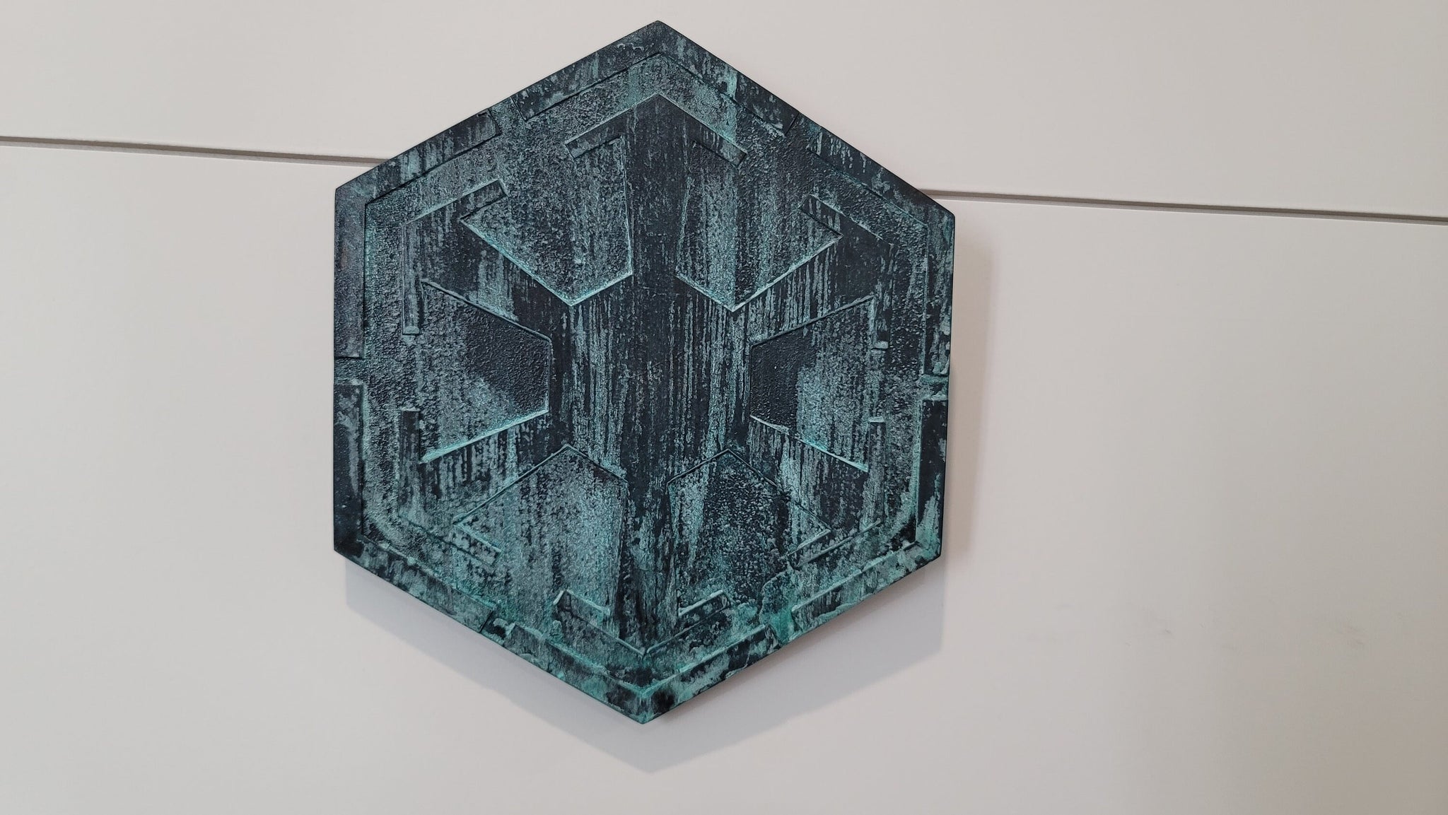 This cast resin item measures just over 10" tall x 9" wide and is roughly 1/2" thick, and has a hook mounted on the back for hanging.